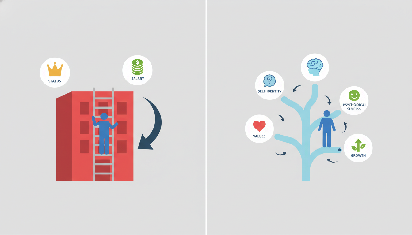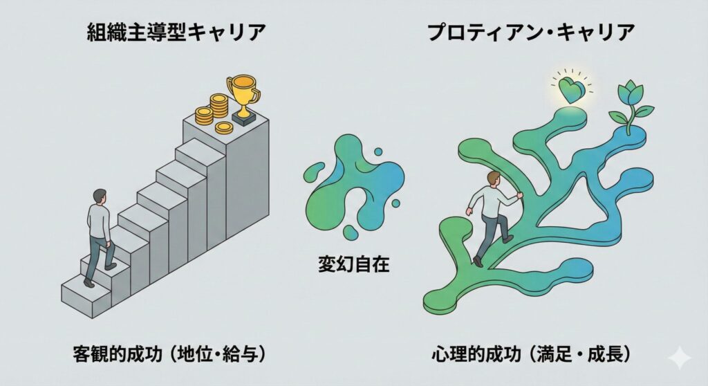 プロティアン・キャリアでは、キャリアの設計主体は個人にあります。自らの価値観とアイデンティティに基づいてキャリアを設計し、成功の尺度は内面的な満足感や成長実感といった「心理的成功」で測られます。組織は、自己実現の「場」として選択されるものとなります。