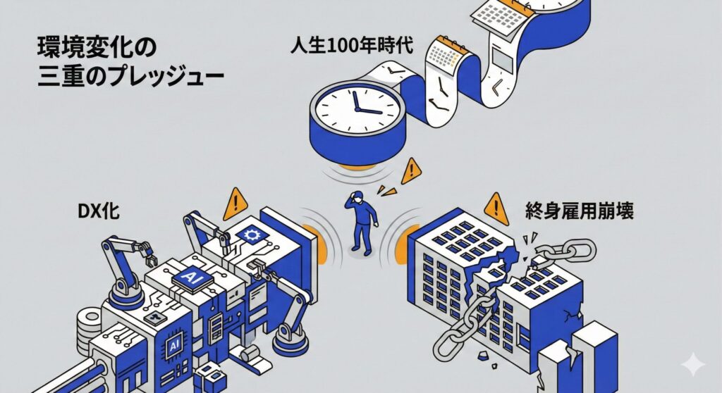 この転換は、単なる価値観の変化ではありません。先に見たように、人生100年時代、DX化、終身雇用崩壊という構造的変化が、この転換を必然としているのです。