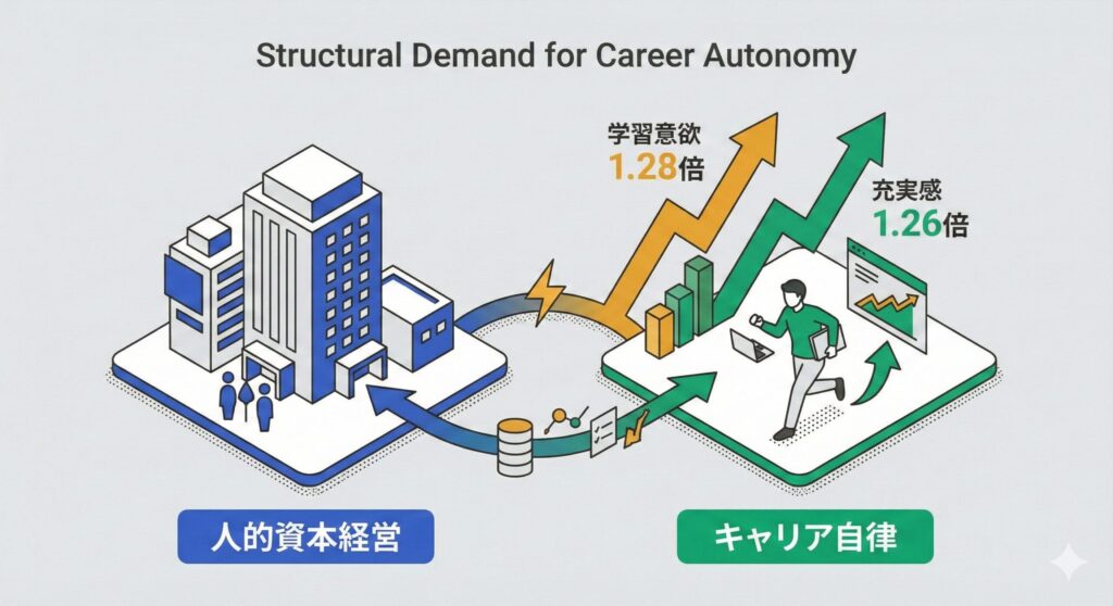 企業側もこの変化を認識しており、大企業の62%がキャリア自律施策に取り組んでいます。さらに重要なのは、キャリア自律が精神論ではなく実際のパフォーマンスに直結することです。キャリア自律度が高い従業員は、学習意欲が1.28倍、仕事充実感が1.26倍高いことが示されています。