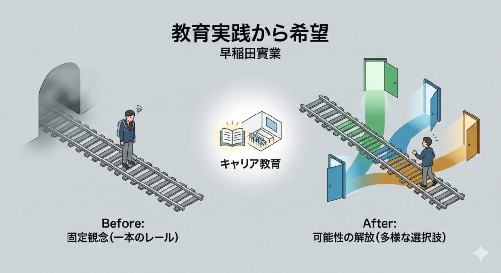 この変化は脅威ではなく、自分の人生を自分で設計できるようになるという解放です。早稲田実業の生徒たちの声が示すように、一つの選択が人生を決定づけるわけではありません。変化は新たな可能性への入り口なのです。