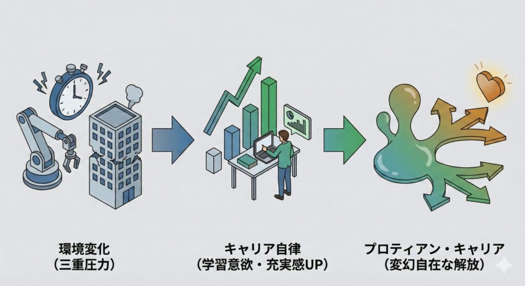 この記事では、プロティアン・キャリアが現代において必要とされる背景を解説しました。人生100年時代、DX化、終身雇用崩壊という三重の構造的変化が、従来の「組織依存型キャリア」を時代遅れにしています。この変化は単なるトレンドではなく、構造的で不可逆的なものです。