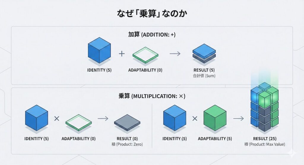 逆に、アダプタビリティが高くても(例:5)、アイデンティティがゼロであれば、結果はやはりゼロ(0 × 5 = 0)です。どんなに変化に対応できても、自分の軸がなければ、方向性を失い漂流します。