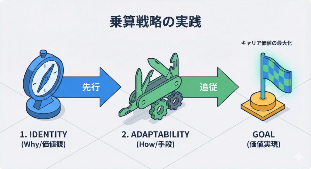 乗算戦略を実践する上で重要なのは、アイデンティティが先行し、アダプタビリティが追従するという順序です。まず「自分は何を大切にするのか」を明確にし、その上で「その価値を実現するために何を学び、どう適応するか」を決定します。この順序を逆にすると、市場の変化に振り回される日和見主義に陥る危険があります。
