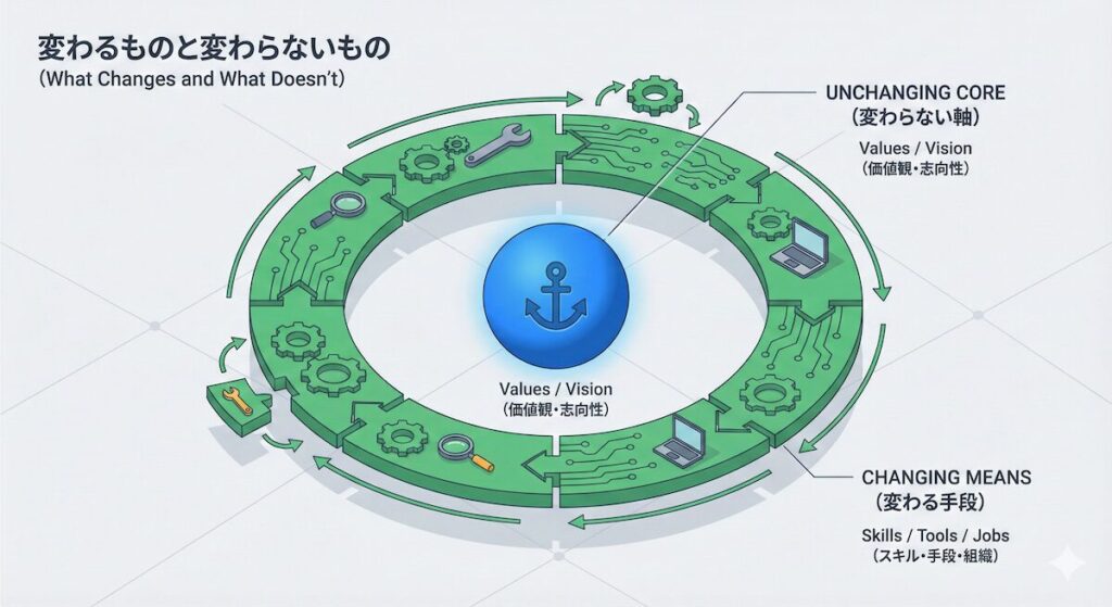 アイデンティティ(不変の軸 = Why) が、アダプタビリティ(変化対応 = How) の方向性を導きます。